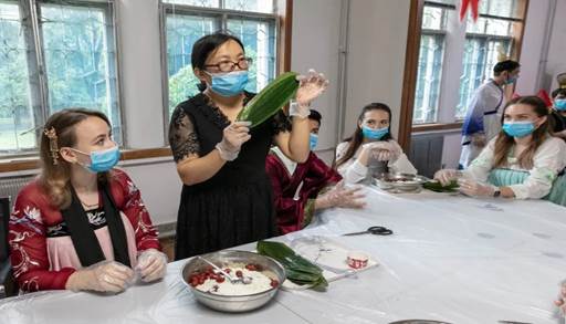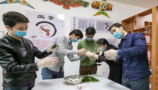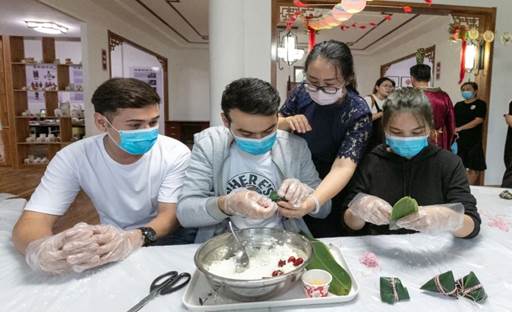 活动现场,老师们向员工们讲解了粽子制作过程中需要使用的材料、用具和制作过程,演示包粽子手法,并手把手教他们叠粽叶、填糯米、放蜜枣、系绳子、包粽子。在包粽子的过程中,职工通过网络连线国外的家人朋友,分享自己的喜悦,让家人真实地看到员工在公司丰富多彩的学习生活。