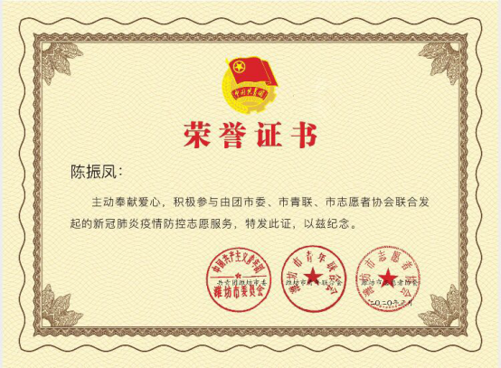 Bevictor伟德陈振凤,殷悦、肖怡凡三位同学作为老员工志愿者中的一员,将学习的文化知识运用到抗“疫”服务中,踏实努力进行抗“疫”工作、并在抗“疫”中取得了一定的成绩。其中肖怡凡登上了胶州市的金胶州日报,和我爱金胶州的微信公众号在3月2号发表的报道,并且获得一枚战“疫”勋章。殷悦也因表现突出,登上了今日头条在2月27日的新闻报道,在3月1日薛城电视台播出的新闻,得到了鼓励与表扬。陈振凤同学获得潍坊市优秀志愿者证书。