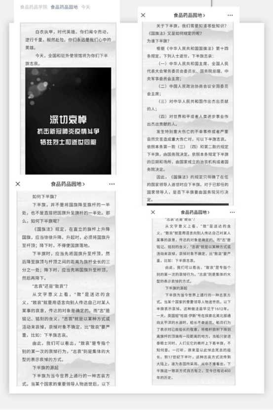 “下半旗”是公众表示哀悼的重要礼节,是一个国家行为。一般是在某些重要人士逝世或重大不幸事件、严重自然灾害发生时来表达全国人民的哀悼。主题团日教育活动中,通过让同学们观看视频直播,默哀三分钟,学习“下半旗”知识。同学们了解学习了《国旗法》下半旗的规定、起源、意义以及如何下半旗的常识。向在抗击疫情斗争中牺牲的烈士和逝去的同胞志哀而下半旗的意义。同时向此次疫情防控中的烈士和逝去的同胞们致以哀思和敬意。