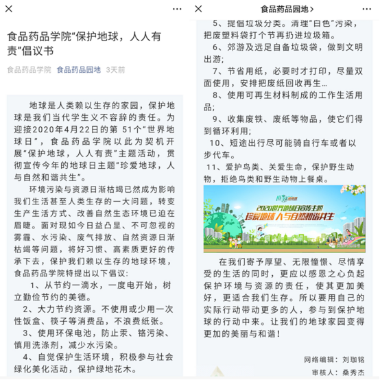 今年“世界地球日”的主题是“珍爱地球,人与自然和谐共生”。在新冠肺炎疫情防控期间,通过举办此次活动,更有利于同学们进一步思考“人与自然和谐共生”的理念,从而激发同学们形成亲近自然、了解自然生态文明的意识,建立正确的自然资源观,切实加强同学们的环保意识,为我们赖以生存的地球奉献自己的力量。