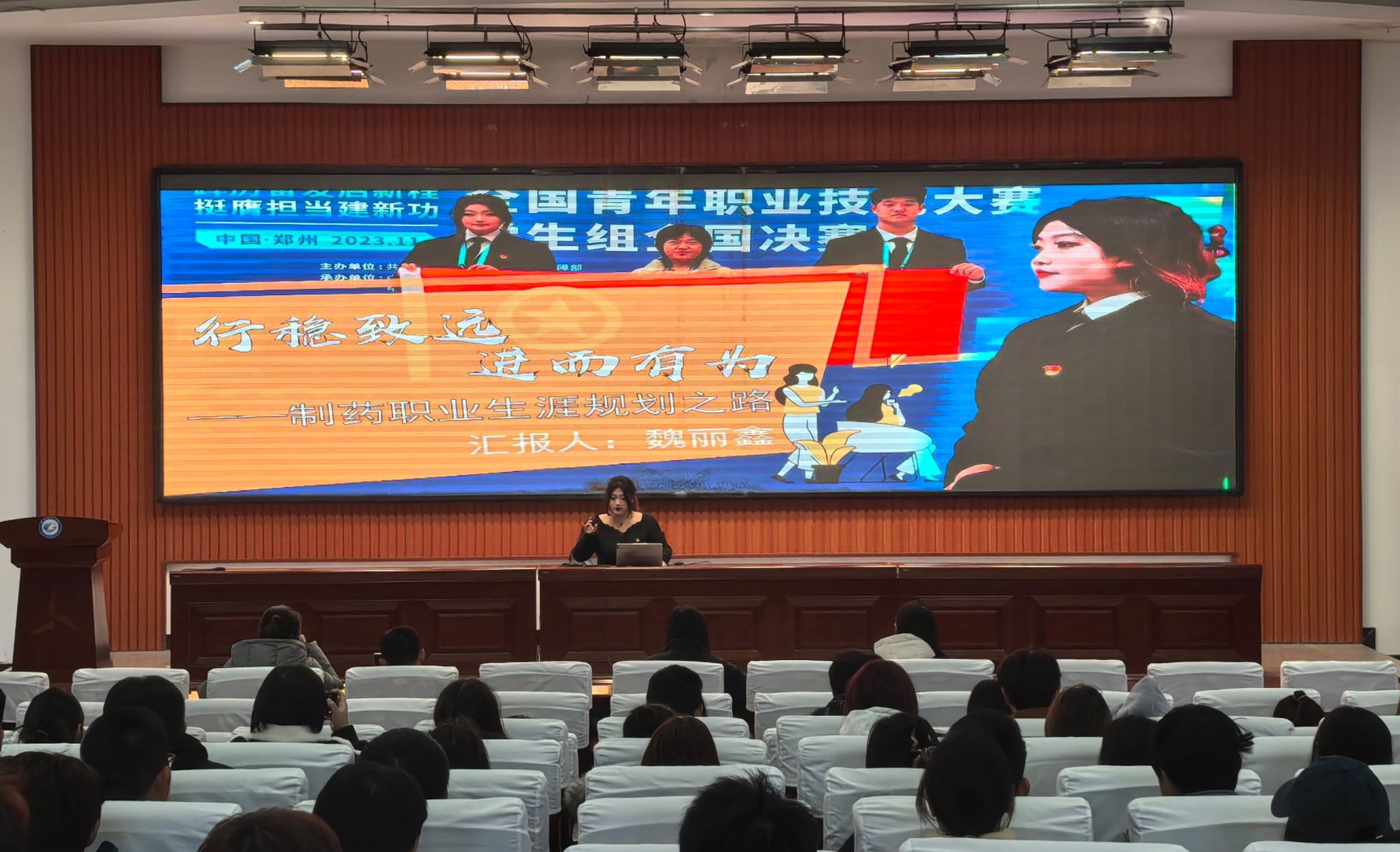 比赛现场气氛紧张而热烈,参赛同学依次上台,通过精彩的PPT展示和生动的演讲,分享了自己的职业规划。他们结合自身的兴趣、优势和专业特点,分析了未来的职业目标、发展路径和实施计划。同时,同学们就个人职业方向进行深度解读,针对个人目标制定了近期、中期和长期的计划,并对其进行评估及调整。评委老师针对每位员工的表现进行提问,帮助同学们发现问题并给出修改建议。