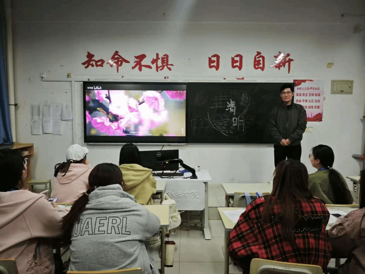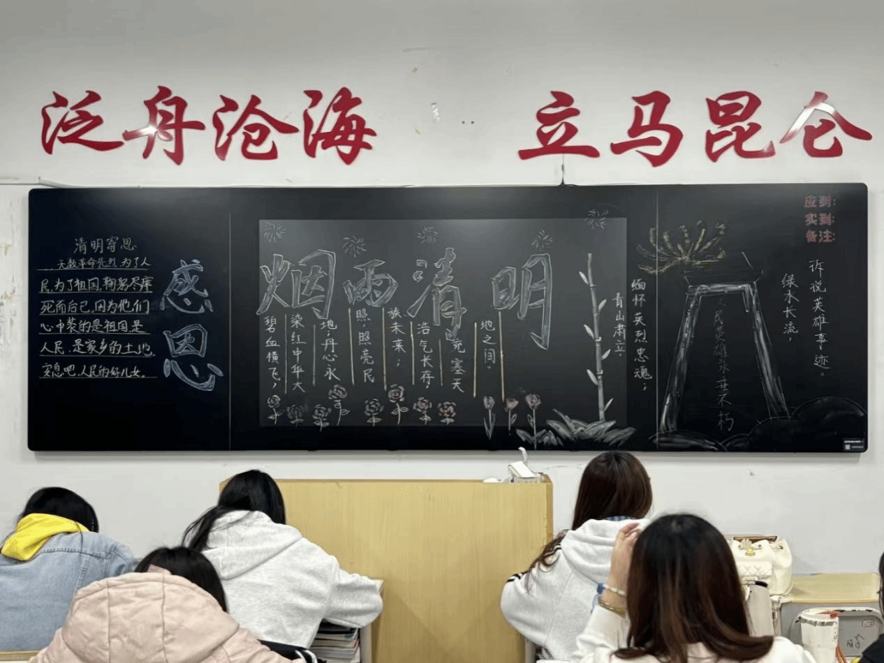 团课上,团支书带领同学们观看了关于清明节起源、习俗及革命先烈英勇事迹的纪录片。纪录片中,同学们仿若穿越千年,见证了清明节从最初的农事节气逐渐演变成兼具缅怀先人与踏青赏春等丰富内涵的传统节日的历程。同时,革命先烈们在战火纷飞的年代,为了民族解放和人民幸福,舍生忘死、浴血奋战的场景也深深震撼着同学们的心灵,生动展现了先烈们崇高的爱国精神和无私的奉献精神。各班还精心布置了以“接捧清明薪火,书写青春担当”为主题的黑板报,色彩鲜艳的图案与铿锵有力的文字相互辉映,营造出庄重而热烈的氛围,时刻激励着同学们铭记历史,缅怀先烈,奋勇前行。